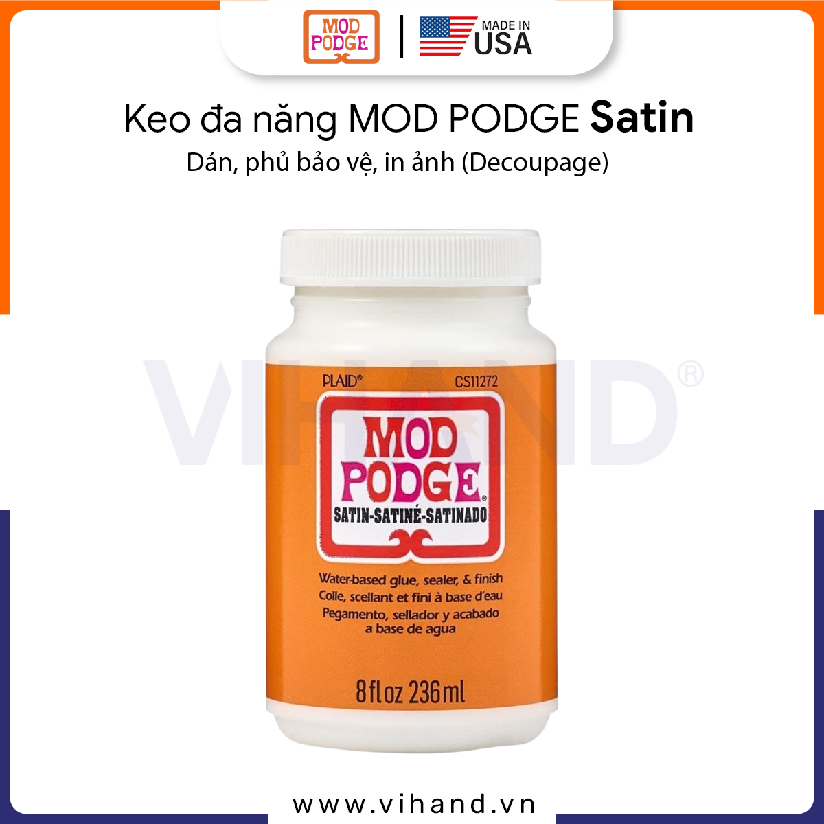 Keo Mod Podge Satin là dòng keo thủ công đa năng 3 trong 1 nổi tiếng đến từ thương hiệu Mod Podge nhập khẩu trực tiếp từ Mỹ (USA), được yêu thích rộng rãi trong các hoạt động sáng tạo, trang trí và nghệ thuật thủ công. Sản phẩm kết hợp ba công dụng trong cùng một loại keo: Dán, phủ bảo vệ và in ảnh (Decoupage) trên nhiều chất liệu hoàn thiện bề mặt, giúp người dùng dễ dàng thực hiện nhiều kỹ thuật thủ công khác nhau chỉ với một sản phẩm duy nhất.