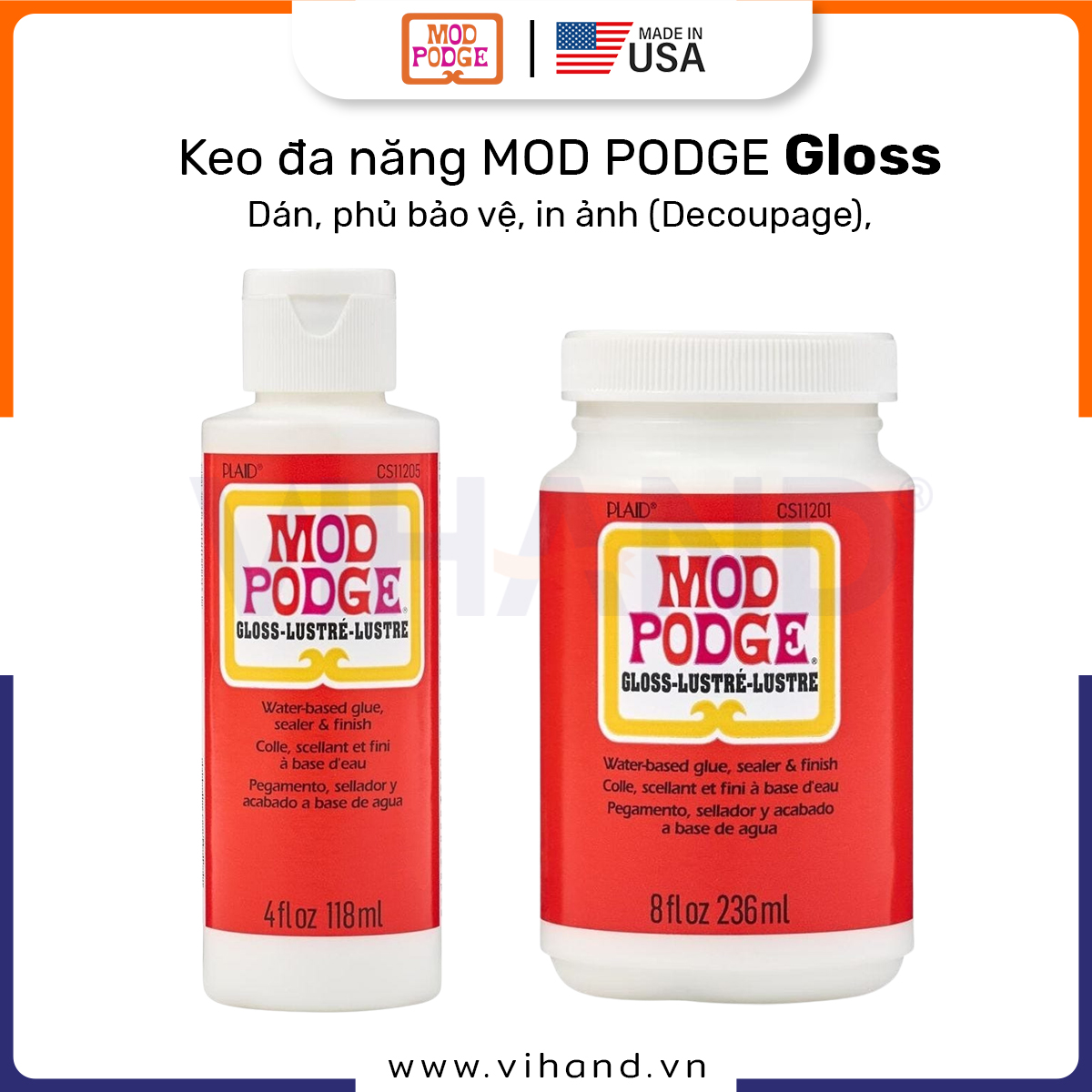 Keo Mod Podge Gloss là dòng keo thủ công đa năng 3 trong 1 nổi tiếng đến từ thương hiệu Mod Podge nhập khẩu trực tiếp từ Mỹ (USA), được yêu thích rộng rãi trong các hoạt động sáng tạo, trang trí và nghệ thuật thủ công. Sản phẩm kết hợp ba công dụng trong cùng một loại keo: Dán, phủ bảo vệ và in ảnh (Decoupage) trên nhiều chất liệu hoàn thiện bề mặt, giúp người dùng dễ dàng thực hiện nhiều kỹ thuật thủ công khác nhau chỉ với một sản phẩm duy nhất.