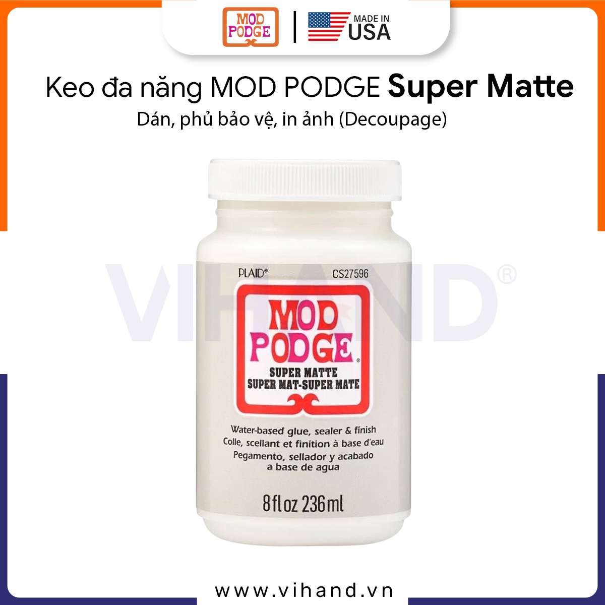 Keo Mod Podge super Matte là dòng keo thủ công đa năng 3 trong 1 nổi tiếng đến từ thương hiệu Mod Podge nhập khẩu trực tiếp từ Mỹ (USA), được yêu thích rộng rãi trong các hoạt động sáng tạo, trang trí và nghệ thuật thủ công. Sản phẩm kết hợp ba công dụng trong cùng một loại keo: Dán, phủ bảo vệ và in ảnh (Decoupage) trên nhiều chất liệu hoàn thiện bề mặt có độ siêu mờ, giúp người dùng dễ dàng thực hiện nhiều kỹ thuật thủ công khác nhau chỉ với một sản phẩm duy nhất.